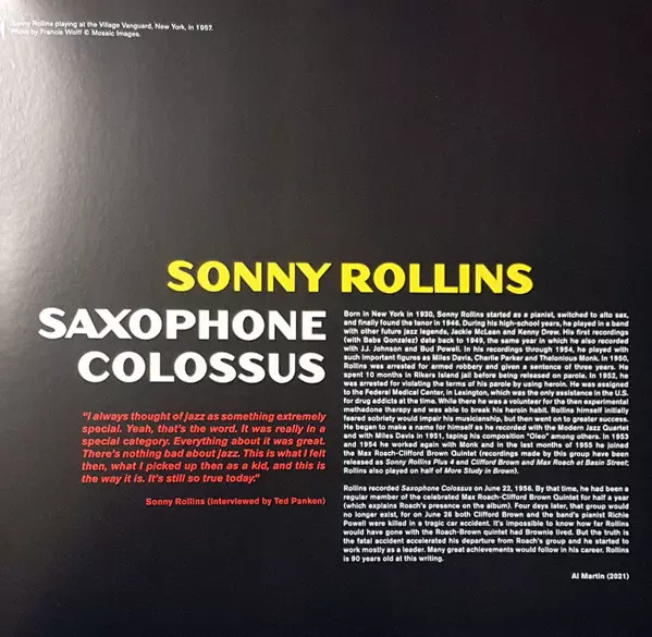Dzięki saksofonowemu kolosowi, Sonny Rollins ostatecznie zyskał wielkie uznanie jako centralna postać w świecie jazzu. Bis zu dieser Veröffentlichung hatte die Musikkritik Rollins nicht ernst genommen, während seine Kollegen bereits wussten, dass er zu den einflussreichen neuen Kräften der Jazz-Szene gehört. Saxophone Colossus aus dem Jahr 1956 ...