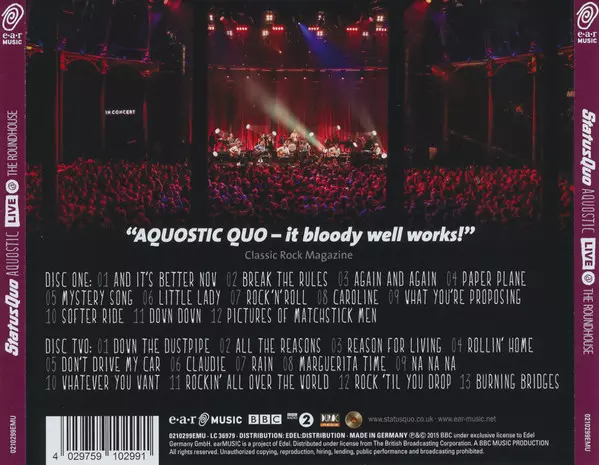 In collaboration with the venerable BBC, the "Aquostic! Live At The Roundhouse" captures the first triumphant acoustic concert by one of Britain's most successful bands, Status Quo. The sensational footage shows a whole new, stripped-back side of Quo, which they also showed on the hit album "Aquostic!" 2014. (Stripped naked)". It was this album ...