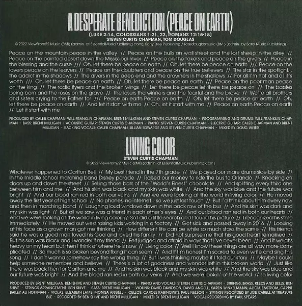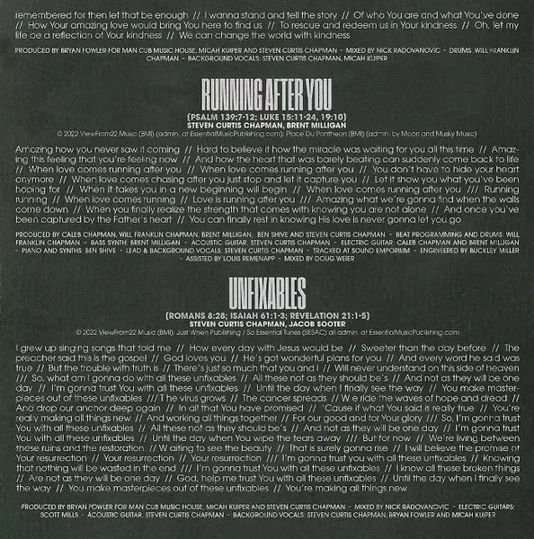 Drums, Drum Programming Will Chapman (2) | Electric Bass, Electric Guitar, Programmed By [Programming] Caleb Chapman (2) | Engineer Buckley Miller | Engineer [Assistant] Buckley Miller | Lead Vocals, Backing Vocals Steven Curtis Chapman | Mixed By Sean Moffitt | Producer Ben Shive, Brent Milligan, Caleb Chapman (2), Steven Curtis Chapman, Will Chapman (2) | Synth [Synth Bass] Brent Milligan | Written-By Caleb Chapman (2), Steven Curtis Chapman, Will Chapman (2)