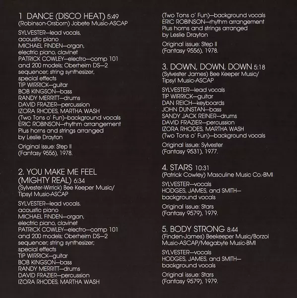 Backing Vocals Two Tons O' Fun | Bass John Dunstan | Drums Sandy Jack Reiner | Engineer Eddie Bill Harris | Guitar James Wirrick | Keyboards Dan Reich | Percussion David Frazier | Written-By Sylvester