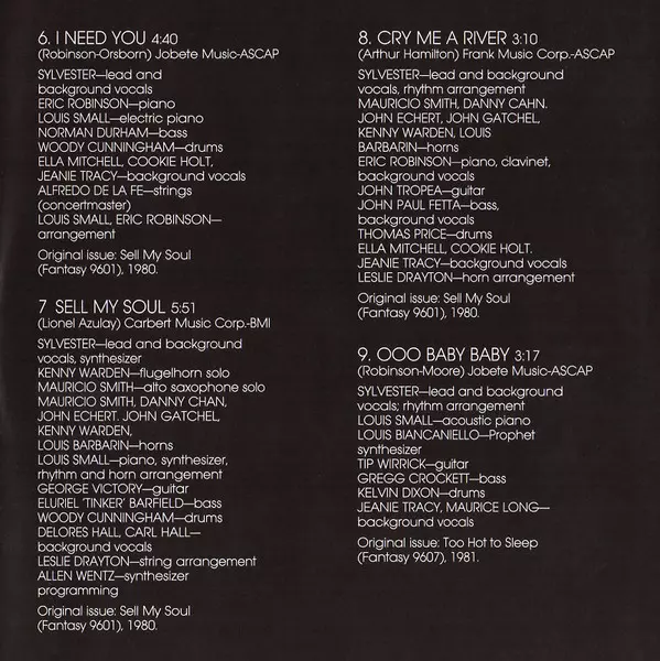 Arranged By [Horns And Strings] Leslie Drayton | Arranged By [Rhythm Arrangement] Eric Robinson (4) | Backing Vocals Two Tons O' Fun | Bass Bob Kingson | Drums Randy Merritt | Engineer Buddy Bruno, Eddie Bill Harris | Guitar James Wirrick | Organ, Electric Piano, Clavinet Michael Finden | Percussion David Frazier | Piano [Acoustic] Sylvester | Synthesizer [Electro-comp 101 And 200 Models, Oberheim Ds-2 Sequencer, String Synthesizer], Effects [Special Effects] Patrick Cowley | Written-By Eric Robinson (4), Victor Orsborn