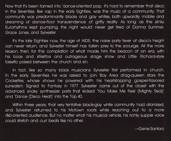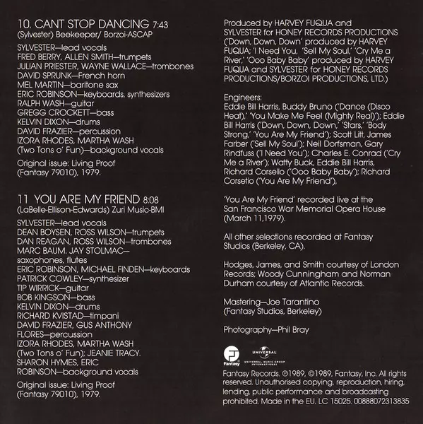 Backing Vocals Two Tons O' Fun | Baritone Saxophone [Baritone Sax] Mel Martin | Bass Greg Crockett | Drums Kelvin Dixon | French Horn David Sprunk | Guitar Ralph Wash | Keyboards, Synthesizer Eric Robinson (4) | Percussion David Frazier | Trombone Julian Priester, Wayne Wallace | Trumpet Allen Smith, Fred Berry | Written-By Sylvester