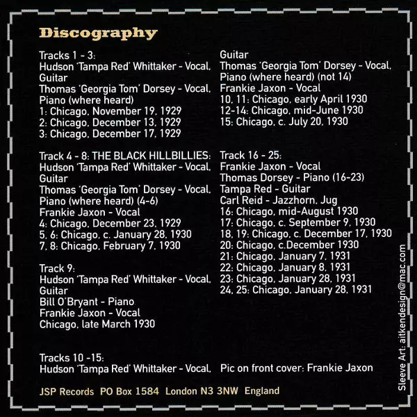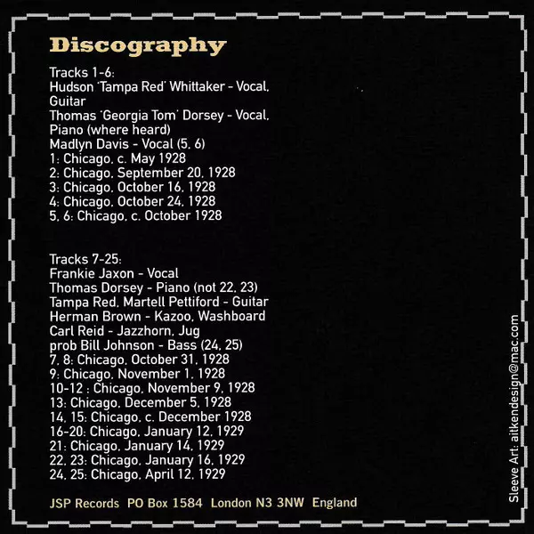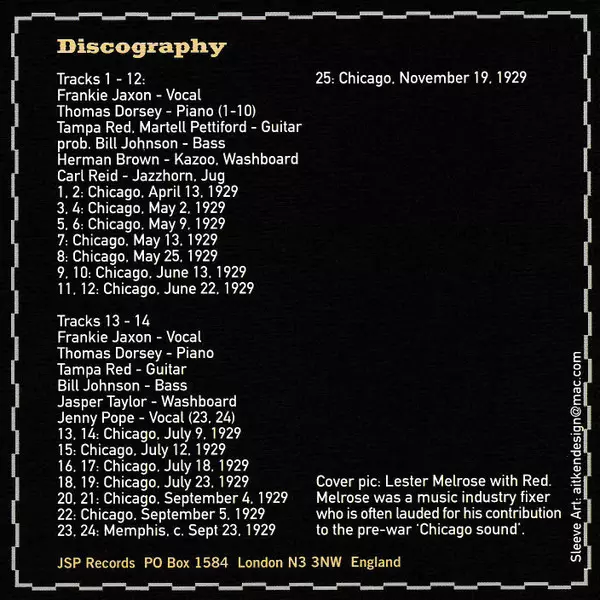 | Guitar Tampa Red | Jug Carl Reid | Kazoo Herman Brown | Piano Georgia Tom | Vocals Frankie Jaxon | |||