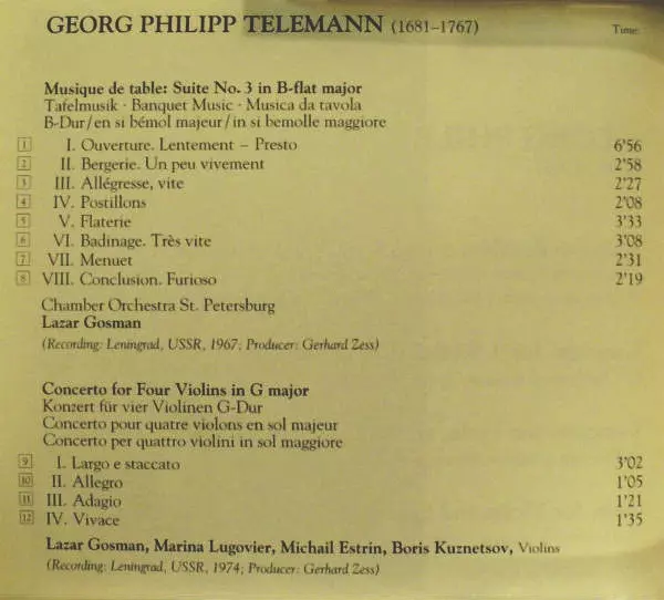 | Wykonawca | Georg Philipp Telemann | Leningrad Chamber Orchestra | Lazar Gosman | Камерный Оркестр Ленинградской Филармонии | Лев Шиндер |