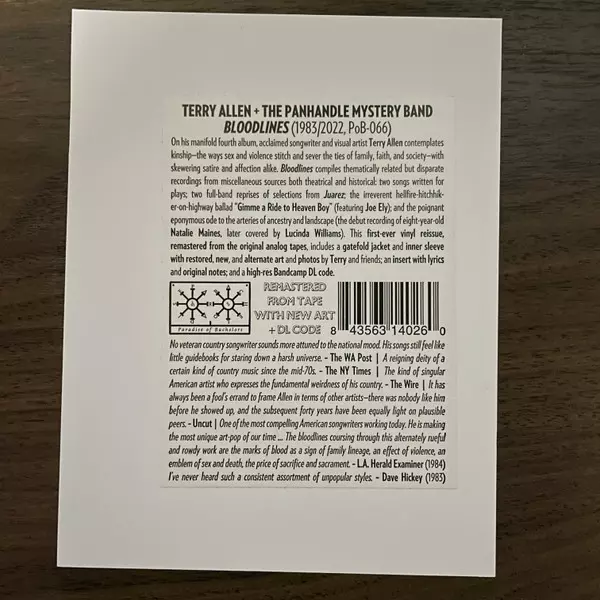 Terry Allen: Bloodlines Wersja na winylu LP w zremasterowane wydanie. Ta konkretna edycja została wydana w USA w wydawnictwie Paradise Of Bachelors dnia 6. maja 2022. Album sięga do gatunku Rock, Folk, World, & Country, Country, Bluegrass i Country-Rock. Remastered Vinyl.