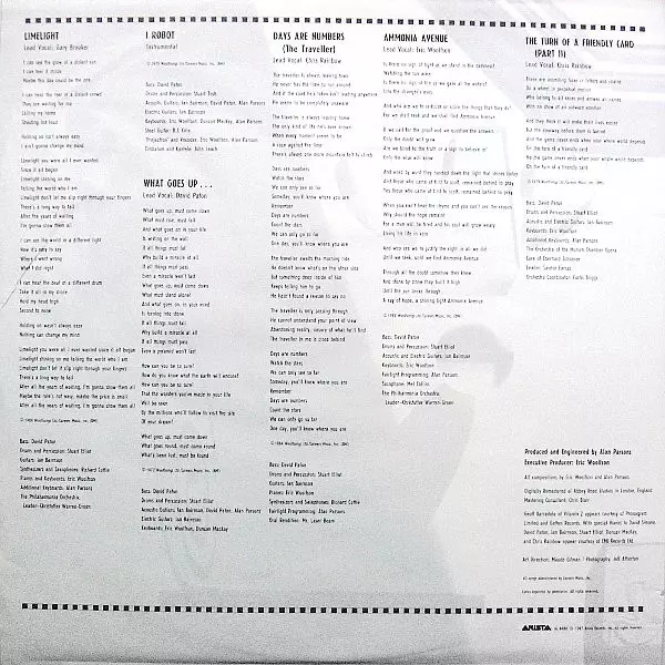 Acoustic Guitar, Electric Guitar Ian Bairnson | Bass David Paton | Drums, Percussion Stuart Elliott | Lead Vocals, Keyboards Eric Woolfson | Leader [Orchestra] Christopher Warren-Green | Orchestra Philharmonia Orchestra | Programmed By [Fairlight] Alan Parsons | Saxophone Mel Collins