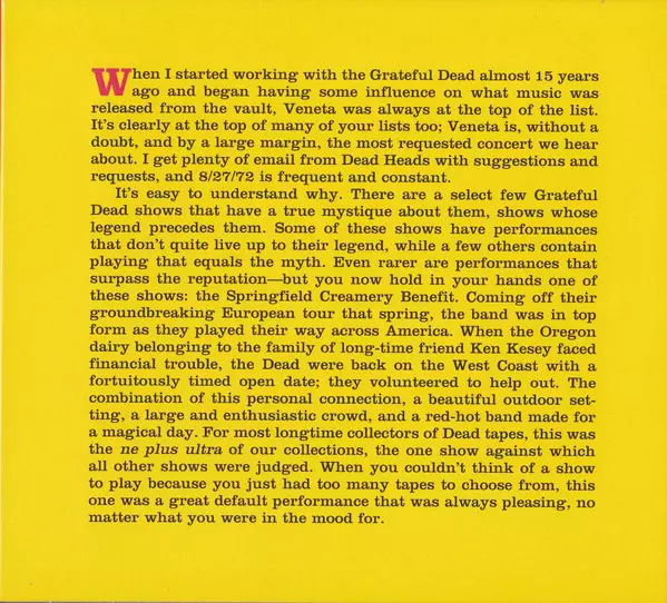 Kdybyste se zeptali komunity fanoušků Grateful Dead za posledních několik desetiletí, aby jmenovali nejvýznamnější koncert této franciské kapely, Deadheads by to shrnuli: nejoblíbenější jsou koncerty ve Fillmore East (New York, 13. února 1970) a Barton Hall (Ithaca, New York, 8. května 1977). Zdaleka nejvýznamnějším koncertem byl koncert 27. srpna 1972 ve Venetě v Oregonu, benefiční akce pro dlouholeté duchovní souputníky (Merry Pranksters) Kena a Chucka Keseyovy , jejichž alternativní rodinný mlékárenský podnik v malé vesnici Springfield v Oregonu, nedaleko městečka Veneta a nedaleko ráje hippies Eugene, byl v těžké situaci. Tato událost se do análů Grateful Dead zapsala pod mnoha názvy: "Veneta, the Field Trip", "The Springfield Cream Benefit", "The Last Acid Test" nebo prostě "The Field Test". Když v srpnu 1972 požádali bratři Ken a Chuck Keseyovi (první z nich je autorem světoznámého románu "Přelet nad kukaččím hnízdem") skupinu Grateful Dead o podporu v podobě benefičního koncertu, není divu, že bez váhání souhlasili. Je pravda, že načasování nemohlo být lepší: Dead měli přesně týden volna mezi koncerty v Berkeley a nadcházejícím velkým podzimním turné v Coloradu. Dohoda byla jednoduchá: Keseys a jejich Veselí šprýmaři se postarali o vše organizační: od povinných povolení, propagace, vymáhání práva až po stavbu pódia a techniky. The Dead a New Riders of the Purple Sage (jako doprovodná kapela) se museli postarat pouze o hudební část akce. Neděle 27. srpna 1972, den velké místní události. Nádherný letní den - a horko. Už kolem poledne byly naměřeny teploty kolem 40 stupňů. V té době se již po komunitě Deadheads v Kalifornii a sousedních státech roznesla zpráva, že jejich oblíbenci budou mít jeden ze svých koncertů pod širým nebem na výstavišti v městečku Veneta ve státě Oregon. Obrovský dav se dal spontánně do pohybu. Na konci koncertu prý přišlo dobrých 25 000 diváků. Celá akce byla tak klidná a harmonická, že mnozí návštěvníci hovořili o malém Woodstocku..... Grateful Dead odehráli tři sety a každá píseň byla zahrána téměř dokonale! Už jen "Dark Star" na začátku třetího setu nebo blok "China Cat Sunflower">"I Know You Rider" jsou čiré kouzlo!!! Hudba nabízí posluchači optimistickou zážitkovou cestu (někdy strašidelnou, jindy strhující) symbolickým cyklem zrození>život>smrt>obnova: "China Cat Sunflower">"I Know You Rider" (zrození), "Playing in the Band", "Bird Song", "Greatest Story Ever Told" (život), "Dark Star">El Paso", "Sing Me Back Home" (smrt) a "Sugar Magnolia" (obnova). The Dead zažili skvělé momenty na všech svých koncertech. Toto vystoupení je však vrcholem toho, čeho byli v tomto desetiletí umělecky schopni. Pro samotnou kapelu byla cesta na sever triumfální, vůbec nešlo o vyčerpávající vystoupení v nejextrémnějších podmínkách jejich kariéry. A právě díky duchu, který panoval mezi publikem, organizátory a kapelou, byla "Veneta, the Field Trip" jedinečným zážitkem. Informace o produktu Dříve nevydaný koncertní film "Sunshine Daydream" s nádherně remasterovaným obrazem a zcela novými stereofonními zvukovými mixy, které vytvořil Jeffrey Norman v TRI Studios v San Rafaelu v Kalifornii a mastering provedl držitel Grammy® David Glasser v Air Show Mastering v Boulderu v Kalifornii. Celý koncert 8 / 27 / 72 smíchaný a zmasterovaný do HDCD z původních 16stopých pásů Jeffrey NormanemZcela nový oboustranný obal od Steva Vance Recenze ,,Koncert, na kterém je založeno trojcédéčko ,,Sunshine Daydream", je jedním z největších okamžiků v koncertní historii skupiny. (...) Pokud si nějaké živé album zaslouží přívlastek "trip", pak je to bezpochyby toto." (stereoplay, listopad 2013) "Od populárních psychedelických klasik z raných let přes písně z mistrovských děl "American Beauty" a "Workingman's Dead" až po country evergreeny, kapela tvořila hudbu tak uvolněnou a někdy virtuózní, jako by chtěla dát zapomenout na všechny útrapy tohoto pastorálního prostředí. (Rolling Stone, listopad 2013) "Zvláštním lákadlem tohoto boxu je překvapivě malý počet videozáznamů Grateful Dead - existuje však pouze jeden záznam Venety. Do oběhu se dostal bootleg filmu - a podle zasvěcených je tento koncertní dokument nejžádanějším v historii Dead. Zvláště proto, že kapela hrála s obrovským nadšením, se směsí kompaktních písní a jamů, rocku, blues, country a rock'n'rollu, zejména Jerry Garcia, který dal průchod svým nejlepším sólům." (Good Times, prosinec 2013 / leden 2014)