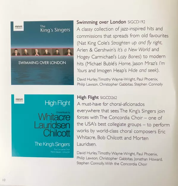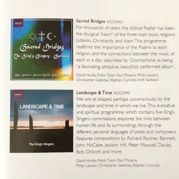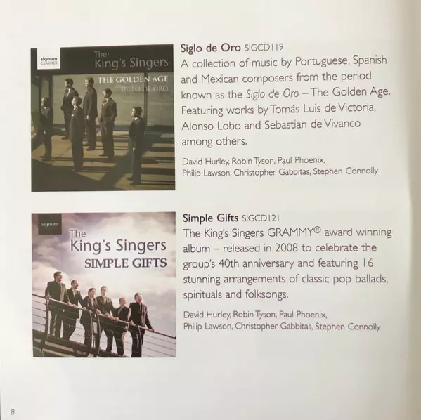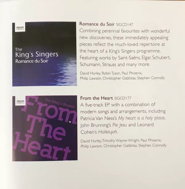The King's Singers: The Best Of The King's Singers Wersja na 2CD w standardowe wydanie. Ta konkretna edycja została wydana w Europa w wydawnictwie Signum Classics dnia 30. października 2012. Album sięga do gatunku Pop, Muzyka klasyczna i Wokal.