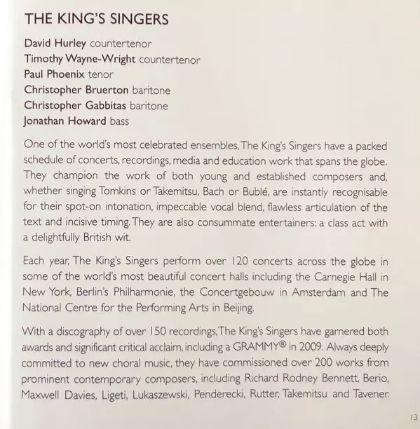 The King's Singers are a British a cappella vocal ensemble founded in 1968. They are named after King's College in Cambridge, England, where the group was formed by six choral scholars. Throughout their career, The King's Singers have been known for their wide-ranging repertoire, w...