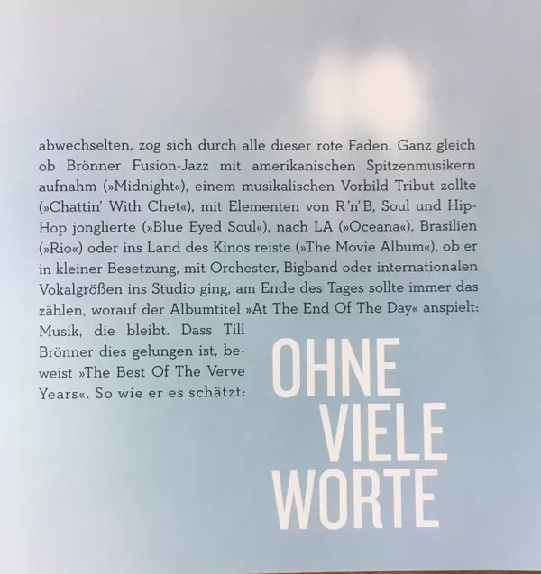 Till Brönner: Best Of The Verve Years Wersja na CD w standardowe wydanie. Ta konkretna edycja została wydana w Niemcy, Austria i Szwajcaria w wydawnictwie Verve Records we współpracy z Universal Music Group dnia 20. listopada 2015. Album można sklasyfikować jako gatunek Jazz.