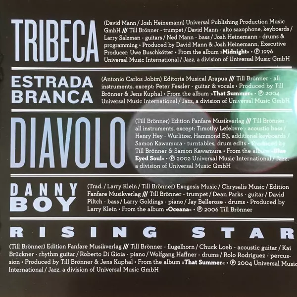 Arranged By [Strings], Conductor [Strings] Nan Schwartz | Drums Matteo Scrimali | Electric Bass Albert Johnson (6) | Electric Piano, Synthesizer Roberto Di Gioia | Flugelhorn Till Brönner | Percussion Roland Peil | Producer Roberto Di Gioia, Samon Kawamura, Till Brönner | Tenor Saxophone, Flute, Bass Clarinet Magnus Lindgren | Written-By Till Brönner