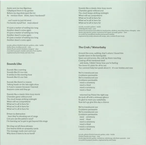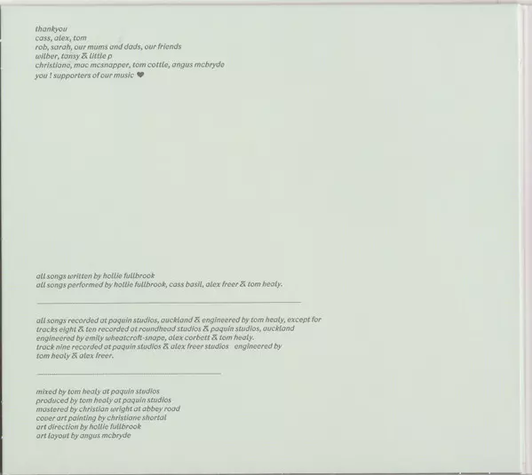 Chimes, Cymbal Alex Freer | Double Bass Cass Basil | Electric Guitar [Fender Jaguar], Synthesizer [Minimoog], Electric Piano [Fender Rhodes], Synthesizer [Oberheim Xpander] Thomas Healy | Vocals, Acoustic Guitar Hollie Fullbrook