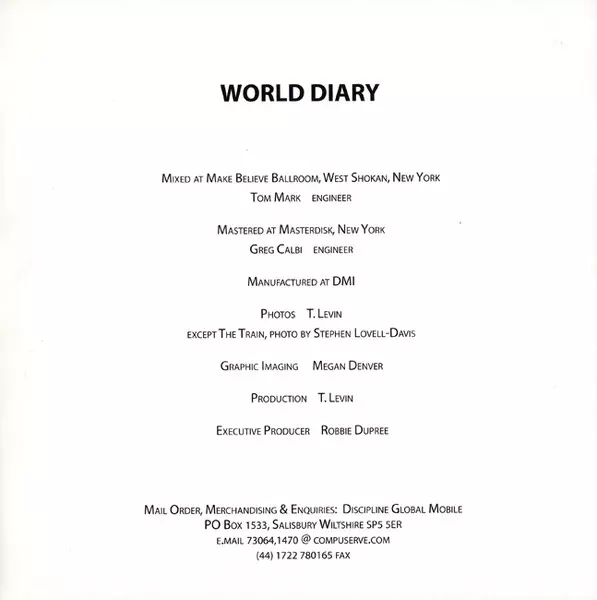 Tony Levin: World Diary Wersja na CD w standardowe wydanie. Ta konkretna edycja została wydana w WIELKA BRYTANIA w wydawnictwie Discipline Global Mobile roku 1996. Album sięga do gatunku Rock, Folk, World, & Country, Rock progresywny i Art Rock. Digifile.