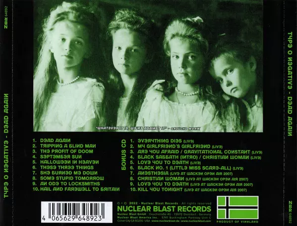 Dead Again je sedmým studiovým albem Type O Negative a po čtyřleté pauze mezi vydáním dlouho očekávaným návratem k bombastickému zvuku, kterým je brooklynská kapela proslulá.S hrací dobou 77:35 minut přináší "Dead Again" hudební cestu nejtemnějšími hlubinami lidského stavu. Láska, ztráta, šílenství, etika, chaos, vaše nejtajnější sny i nejhorší ...