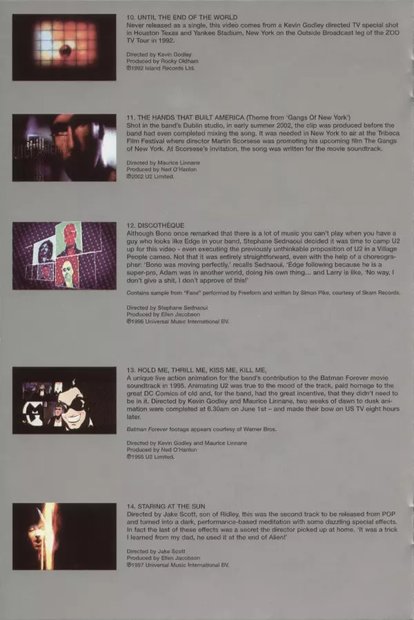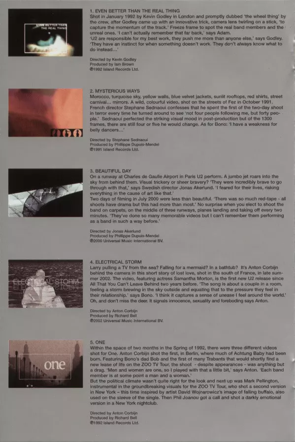 The Irish band U2 has been making rock music history for the last 25 years and is undoubtedly one of the chosen heroes on the Olympus of pop music history.The Best of 1990-2000 DVD summarizes the second decade of the band's work around frontman Bono through video clips. In addition to a number of well-known hits such as Beautiful Day, One, Numb or Hold Me, Thrill Me, Kiss Me, Kill Me, the DVD in the Superjewel Box also includes bonus material from the now-famous digipack version (an elaborate DVD, alternate, unreleased music videos, commentaries by the music video directors, short documentaries and several bonus tracks).