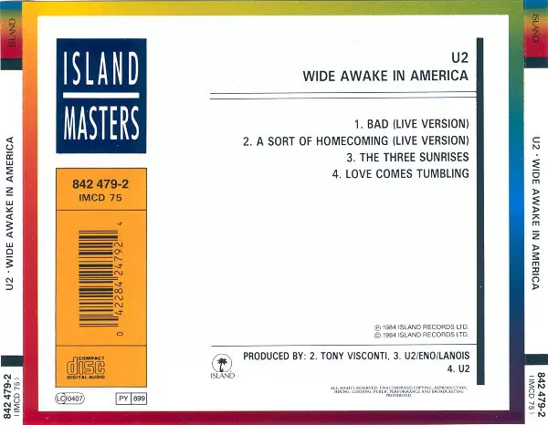 Wide Awake In America is an album by Irish rock band U2 , released in 1985. It is a live album recorded during the band's successful Joshua Tree Tour. The album was released in the United States and Canada on 20 October 1985 and in the United Kingdom on 11 November 1985. The album was produced by Jimmy Iovine and U2. Wide Awake In America was th...