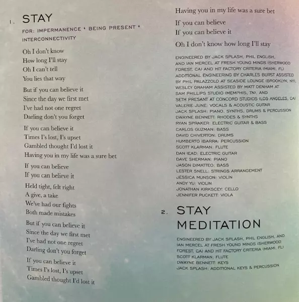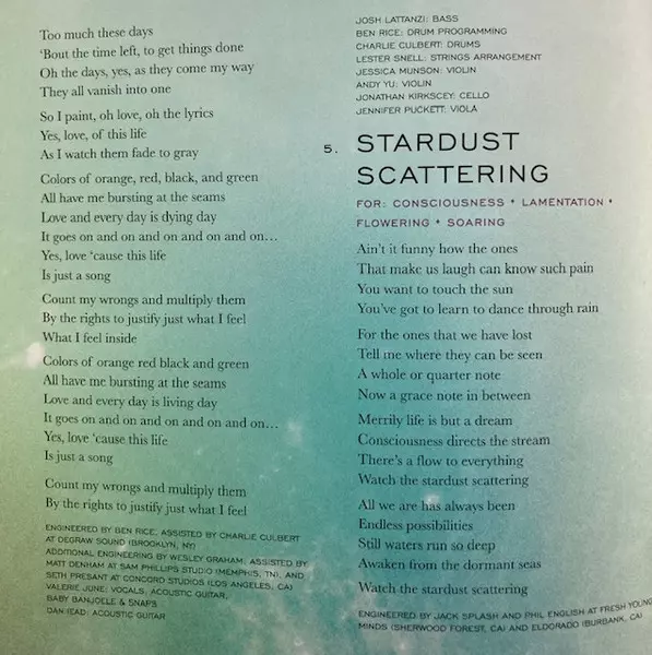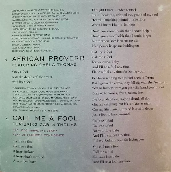 Engineer [Additional Engineering] Seth Presant | Engineer [Additional Engineering], Drum [Steel Tongue Drum], Singing Bowls [Tibetan Singing Bowls] Valerie June | Engineer, Piano, Synthesizer Jack Splash | Flute [Bamboo Flute], Flute [Native American Flute], Concert Flute Albert Allenback