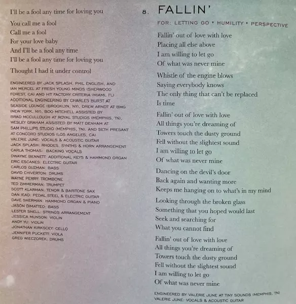 Bass Carlos Guzman (3), Jason DiMatteo | Cello Jonathan Kirkscey | Drums Dave Chiverton | Electric Guitar Dan Iead | Electric Guitar, Bass Ryan Spraker | Engineer Ian Mercel, Phil English | Engineer [Additional Engineering Assisted By] Matt Denham, Phil Palazzolo | Engineer [Additional Engineering] Charles Burst, Seth Presant, Wesley Graham (2) | Engineer, Piano, Synth, Drums, Percussion Jack Splash | Flute Scott Klarman | Organ [Rhodes], Synth Dwayne Bennett | Percussion Humberto Ibarra | Piano Dave Sherman (7) | Strings [Strings Arrangement] Lester Snell | Viola Jennifer Puckett | Violin Andy Yu, Jessie Munson | Vocals, Acoustic Guitar Valerie June