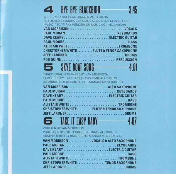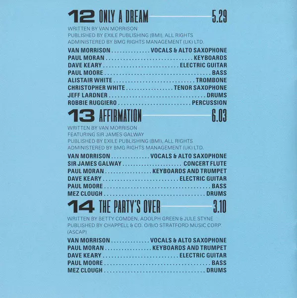 Bass Paul Moore | Drums Jeff Lardner | Electric Guitar Dave Keary | Keyboards Paul Moran (5) | Tenor Saxophone Christopher White (11) | Trombone Alistair White | Vocals, Alto Saxophone Van Morrison | Written-By Van Morrison