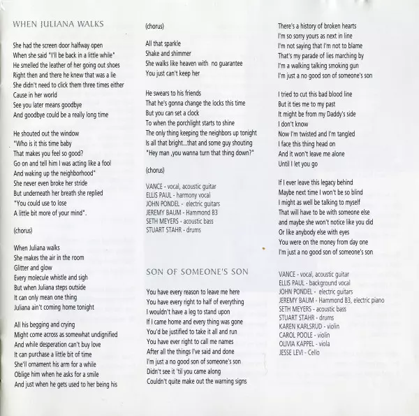 Acoustic Bass Seth Meyers (2) | Drums Stuart Stahr | Electric Guitar [Electric Guitars] John Pondel | Harmony Vocals [Harmony Vocal] Ellis Paul | Organ [Hammond B3] Jeremy Baum | Vocals [Vocal], Acoustic Guitar Vance Gilbert