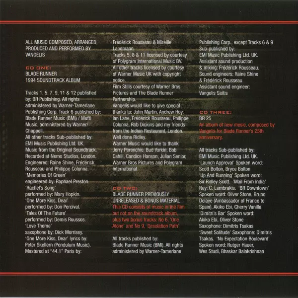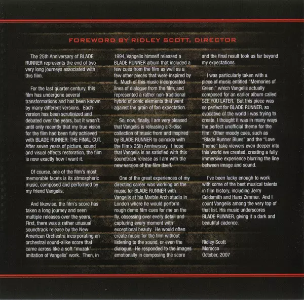 To celebrate the 25th anniversary of Ridley Scott's "Blade Runner", Vangelis is releasing a 3-CD "Blade Runner Trilogy" collection, featuring both the official soundtrack and previously unreleased and brand new tracks written just for this special anniversary.