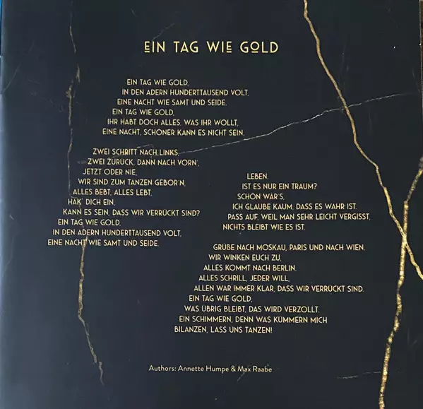 | Author, Composed By Annette Humpe, Max Raabe | Cello, Arranged By [Arranger (Instruments/Vocals)] Eckart Runge | Mastered By [Mastering Assistant] Laura Morina | Mastered By [Mastering Engineer] Sascha Bühren | Mixed By [Mixing Engineer], Producer Hans Hafner | Piano, Arranged By [Arranger (Instruments/Vocals)] Jacques Ammon | Recorded By [Recording Engineer] Jonas Gehrmann | Vocals, Featuring Max Raabe | |||