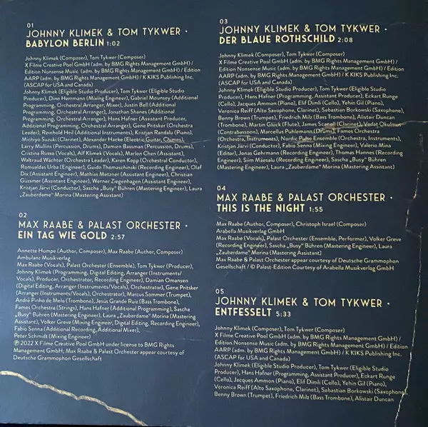 | Alto Saxophone, Clarinet Veronica Reiff | Bass Trombone Friedrich Milz | Cello Eckart Runge, Elif Dimli | Clarinet James Scannell | Composed By, Producer [Eligible Studio Producer] Johnny Klimek, Tom Tykwer | Conductor Kristjan Järvi | Contrabassoon Vedat Okumuş | Drums Marcellus Puhlemann | Editor Valerio Mina | Flute Martin Glück (3) | Mastered By [Mastering Assistant] Laura Morina | Mastered By [Mastering Engineer] Sascha Bühren | Mixed By [Mixing Engineer] Fabio Senna | Orchestra, Instruments Fame's Orchestra, Nordic Pulse | Piano Jacques Ammon, Yejin Gil | Programmed By, Producer [Assistant Producer] Hans Hafner | Recorded By [Recording Engineer] Jonas Gehrmann, Siim Mäesalu, Thomas Hannes | Saxophone Sebastian Borkowski | Trombone Alistair Duncan | Trumpet Benny Brown | |||