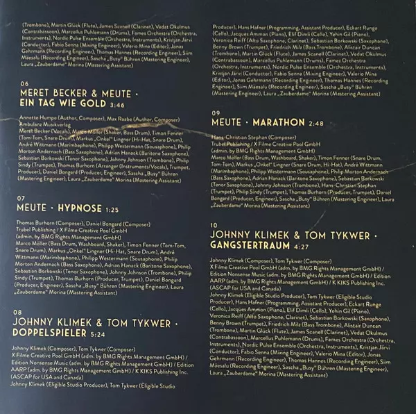 | Alto Saxophone, Clarinet Veronica Reiff | Bass Trombone Friedrich Milz | Cello Eckart Runge, Elif Dimli | Clarinet James Scannell | Composed By, Producer [Eligible Studio Producer] Johnny Klimek, Tom Tykwer | Conductor Kristjan Järvi | Contrabassoon Vedat Okumuş | Drums Marcellus Puhlemann | Editor Valerio Mina | Flute Martin Glück (3) | Mastered By [Mastering Assistant] Laura Morina | Mastered By [Mastering Engineer] Sascha Bühren | Mixed By [Mixing Engineer] Fabio Senna | Orchestra, Instruments Fame's Orchestra, Nordic Pulse | Piano Jacques Ammon, Yejin Gil | Programmed By, Producer [Assistant Producer], Composed By Hans Hafner | Recorded By [Recording Engineer] Jonas Gehrmann, Siim Mäesalu, Thomas Hannes | Saxophone Sebastian Borkowski | Trombone Alistair Duncan | Trumpet Benny Brown | |||