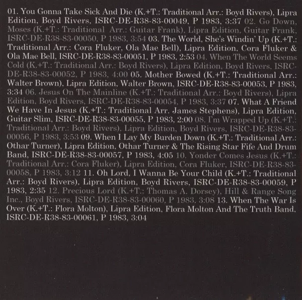 | 9 | Othar Turner, The Rising Star Fife and Drum Band: When I Lay My Burden Down | 4:05 min | |