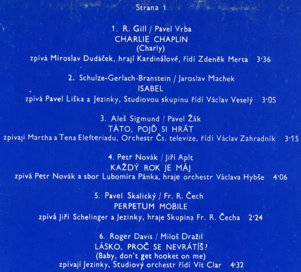 | Backing Band Studiová Skupina Bohumil Veselý | Leader Bohumil Veselý | Lyrics By [Czech] Jaroslav Machek | Vocals Jezinky, Pavel Liška | Written By Branstein | Written-By Hartmut Schulze-Gerlach | |||