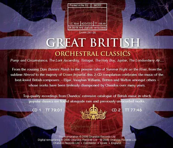 Various: Great British Orchestral Classics Wersja na 2CD w zremasterowane wydanie. Ta konkretna edycja została wydana w WIELKA BRYTANIA w wydawnictwie Chandos dnia 20. września 2005. Album sięga do gatunku Muzyka klasyczna i Modernism.