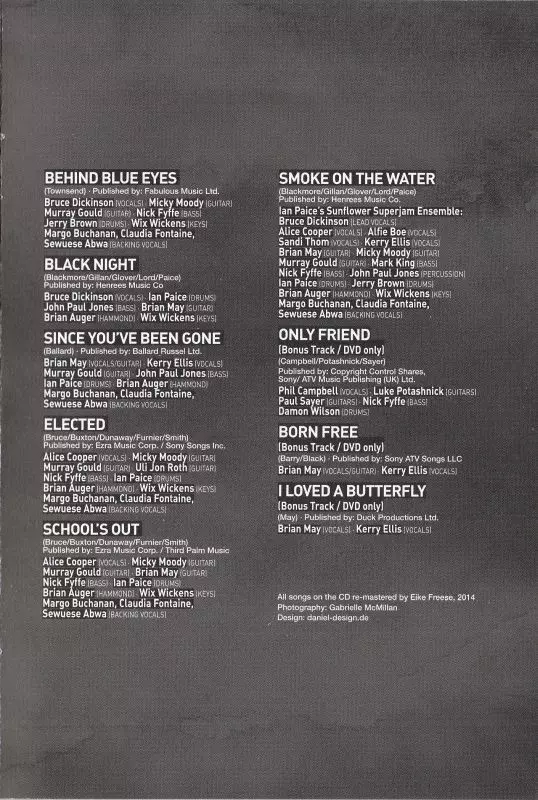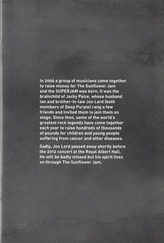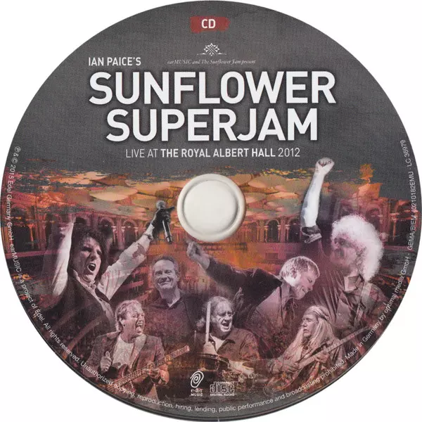 A feast for the eyes and ears, this spectacular live documentary captures the second annual Sunflower Superjam at arguably one of London's most prestigious venues: the Royal Albert Hall. Before the event was open to all rock fans, 'The Jam' was a private charity event organised by Ian Paice (Deep Purple) and his wife Jacky Paice - rock's biggest stars came together to play classic songs and raise money for various charities. 'Ian Paice's Sunflower Superjam - Live At The Royal Albert Hall 2012' could hardly have been more powerful; Mark King (Level 42) teamed up with Hammond organ legend Brian Auger to deliver groovy renditions of two of their biggest hits; Iron Maiden's Bruce Dickinson lending his explosive voice to Thin Lizzy's "Emerald" and The Who's "Behind Blue Eyes"; Alice Cooper playing his classics "Elected" and "School's Out" with Ian Paice and Brian May; or Bruce Dickinson, Brian May, John Paul Jones and Ian Paice (if that's not an absolute "dream band" ... ), who will play "Black Night" (Deep Purple) together on stage. British blues rockers The Temperance Movement, now a respected force on the British rock scene, made their debut at this show to a large audience, while Steve Balsamo paid tribute to Jon Lord with "Pictured Within", foreshadowing the great tribute The Sunflower Jam would pay to Lord two years later with "Celebrating Jon Lord". And just when you, as an audience member, think it just couldn't get any better, all the musicians come together on stage and cause an absolute explosion of joy during the closing "Smoke on The Water": a feeling that is present in every song on this exciting record. This spectacular live document is a feast for the eyes and ears. The footage captures the second annual Sunflower Jam at one of London's most prestigious venues: the Royal Albert Hall. Before the event was open to all rock fans, 'The Jam' was a private charity event created and organised by Ian Paice (Deep Purple) and his wife Jacky - the biggest rock stars came together to play classic songs and raise money for various charities. The Ian Paice Sunflower Superjam - Live At The Royal Albert Hall 2012 concert could not have been more impressive: Mark King (Level 42) teamed up with Brian Auger, the Hammond organ legend, for some pretty blistering renditions of his two greatest hits, while Iron Maiden's Bruce Dickinson lent his explosive voice to Thin Lizzy's Emerald and The Who's Behind Blue Eyes, Alice Cooper joining Ian Paice and Brian May to perform his classics Elected and School's Out, and Bruce Dickinson, Brian May, John Paul Jones and Ian Paice joining together on stage for a rendition of Black Night (Deep Purple). British blues rockers The Temperance Movement, now an established force on the British rock scene, made their debut in front of a large audience, and Steve Balsamo paid tribute to Jon Lord with his band Pictured Within, foreshadowing the great tribute The Sunflower Jam would pay to him two years later on their album 'Celebrating Jon Lord'. And just when you think it couldn't get any better as an audience member, all the musicians come together on stage to cause an absolute explosion of enthusiasm, joy and enjoyment of the music during the closing Smoke on The Water - a feeling that is present in every song on this exciting record. 01 Ain't No Telling feat. The Temperance Movement 02 This Wheel's On Fire feat. Sandi Thom & Brian Auger 03 The Sails of Charon feat. Uli Jon Roth 04 Rock And Roll feat. Uli Jon Roth & Alfie Boe 05 Pictured Within feat. Steve Balsamo & Brian Auger 06 Something About You feat. Mark King & Brian Auger 07 Lessons In Love feat. Mark King & Brian Auger 08 Emerald feat. Bruce Dickinson and Uli Jon Roth 09 Behind Blue Eyes feat. Bruce Dickinson 10 Black Night feat. Bruce Dickinson, Brian May, John Paul Jones, Ian Paice, Brian Auger 11 Since You've Been Gone feat. Kerry Ellis, Brian May, John Paul Jones, Ian Paice, Brian Auger 12 Elected feat. Alice Cooper, Uli Jon Roth, Ian Paice, Brian Auger 13 School's Out feat. Alice Cooper, Brian May, Ian Paice, Brian Auger 14 Smoke On The Water feat. Ian Paice's Sunflower Superjam Ensemble The DVD contains all tracks from the CD and bonus tracks by Brian May, Kerry Ellis and The Temperance Movement. Brian May & Kerry Ellis (bonus track) - I Loved A Butterfly feat. Brian May & Kerry Ellis (bonus track) - Only Friend feat. The Temperance Movement (bonus track) Review "The fun factor is very high." (Good Times, April/May 2015)