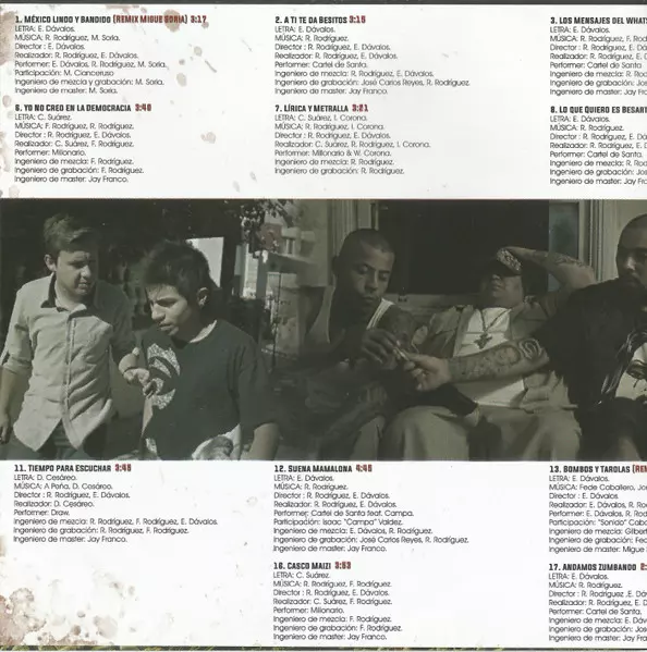 | Directed By Eduardo Dávalos, Román Rodríguez (3) | Lyrics By Eduardo Dávalos | Mastered By Jay Franco | Mixed By Eduardo Dávalos, Román Rodríguez (3) | Music By Román Rodríguez (3) | Performer Cartel De Santa | Realization Eduardo Dávalos, Román Rodríguez (3) | Recorded By José Carlos Reyes, Román Rodríguez (3) | |||