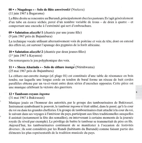 | 1 | François Muduga: Chant À Voix Chuchotée Et Cithare Inanga = Whispered Song With Inanga Zither Accompaniment | 5:36 min | |