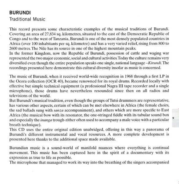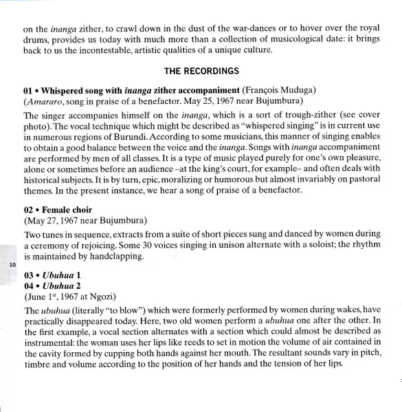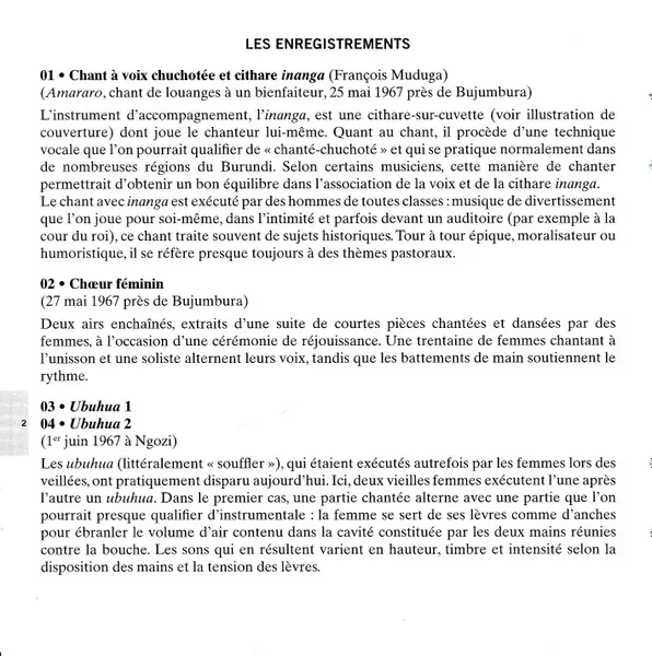 | 13 | Unknown Artist: Suite De Cithare Inanga Et Voix Chuchotée = Whispered Chant With Inanga Zither Accompaniment | 13:31 min | |