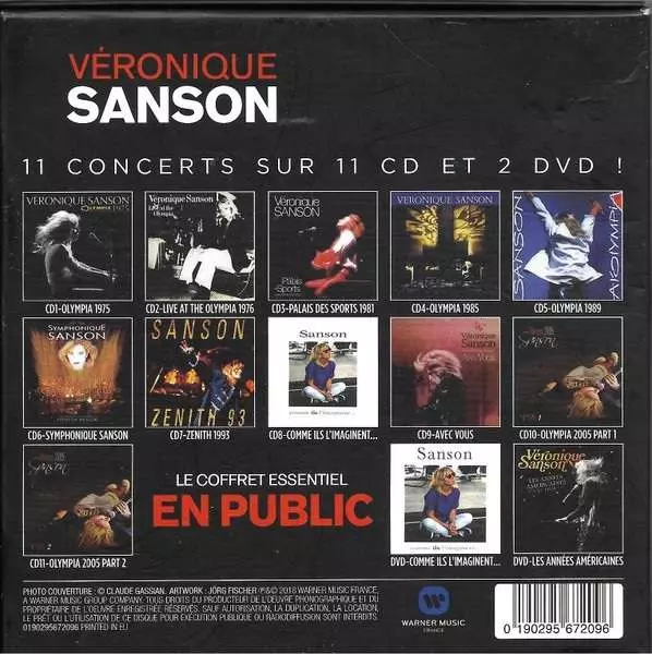 Véronique Sanson: Le Coffret Essentiel En Public Wersja na 11CD/2DVD/Zestaw pudełkowy w standardowe wydanie. Ta konkretna edycja została wydana w Europa w wydawnictwie Warner Music France dnia 5. lipca 2018. Album sięga do gatunku Pop i Chanson. Live.