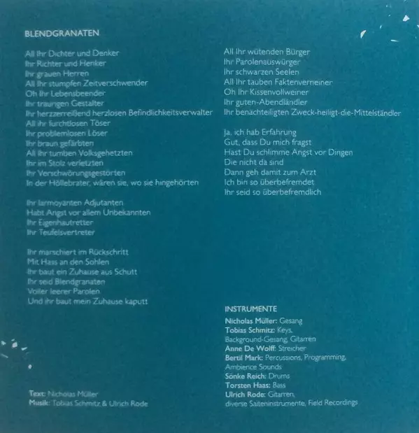 Backing Vocals Carsten Thonack, Roda Bade | Bass Torsten Haas | Drums Sönke Reich | Guitar Ulrich Rode | Keyboards, Backing Vocals, Guitar Tobias Schmitz | Lyrics By Nicholas Müller | Music Consultant Tobias Schmitz | Noises Bertil Mark | Strings Anne de Wolff | Vocals Nicholas Müller