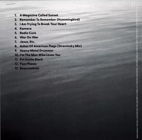 Wilco's "Yankee Hotel Foxtrot," released in 2002, is an album that stands as a testament to the band's creative resilience and innovation. The album's production was famously tumultuous, with the band being dropped from their label before the record's release. Despite this, "Yankee Hotel Foxtrot" was met with critical acclaim and is often cited as one of the greatest albums of the early 2000s. It showcases a blend of alternative rock, experimental sounds, and introspective lyrics. The tracklist includes songs like "I Am Trying To Break Your Heart," which sets the tone with its complex structure and raw emotion, and "Jesus, Etc.," known for its hauntingly beautiful string arrangements. Other tracks such as "Heavy Metal Drummer" reminisce with a sense of nostalgia, while "Ashes Of American Flags" delves into themes of disillusionment and loss. The album closes with "Reservations," a poignant ballad that encapsulates the album's themes of love and uncertainty. "Yankee Hotel Foxtrot" remains a pivotal release in Wilco's discography and a defining moment in early 21st-century music.