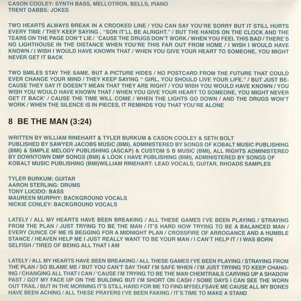Backing Vocals Maureen Murphy (3), Nickie Conley | Bass Tony Lucido | Bass [Additional Bass] Gabe Simon | Drums, Percussion Aaron Sterling | Guitar Tyler Burkum | Keyboards, Electric Organ [B3], Synth [Synth Bass], Omnichord, Piano, Backing Vocals, Whistling Cason Cooley | Lead Vocals, Guitar William Rinehart (2) | Written-By Gabe Simon, William Rinehart (2)