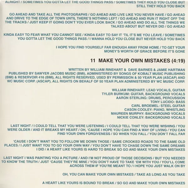 Backing Vocals Maureen Murphy (3), Nickie Conley | Bass Tony Lucido | Drums, Percussion Aaron Sterling | Guitar, Backing Vocals Tyler Burkum | Lead Vocals, Guitar William Rinehart (2) | Piano, Whistling Cason Cooley | Steel Guitar Carl Broemel | Written-By Dave Barnes, Jamie Hartman, William Rinehart (2)