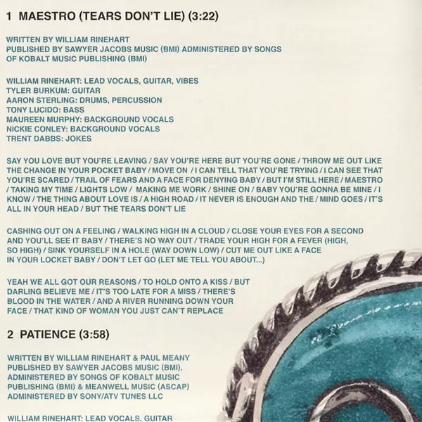 Backing Vocals Maureen Murphy (3), Nickie Conley | Bass Tony Lucido | Drums, Percussion Aaron Sterling | Guitar Tyler Burkum | Lead Vocals, Guitar William Rinehart (2) | Piano, Mellotron Cason Cooley | Steel Guitar Carl Broemel | Written-By Anderson East, Josh Kerr, William Rinehart (2)