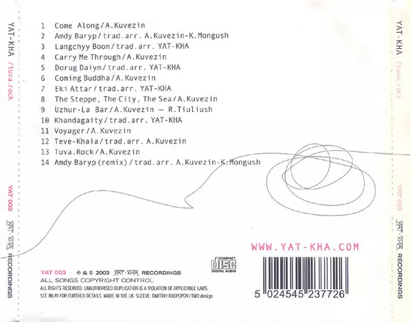 Yat-Kha is a band from Tuva, a Russian republic located in southern Siberia, known for its unique blend of Tuvan throat singing and rock music. The band was founded in the early 1990s by Albert Kuvezin and Russian avant-garde musician Ivan Sokolovsky. Yat-Kha's music is characteriz...
