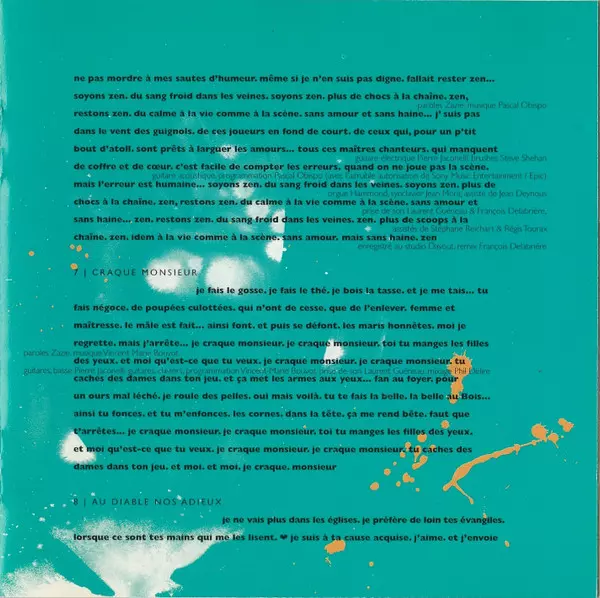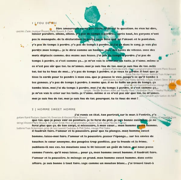 Bass Nicolas Fiszman | Drums Yvan Ackermann | Guitar Kamil Rustam, Michaël Ohayon | Mixed By Phil Delire | Ondes Martenot Thomas Bloch | Organ, Programmed By Zazie | Recorded By [Prise De Son] Laurent Guéneau | Scratches Dee Nasty | Shekere, Temple Bells [Tibet Bell], Cymbal [Chinese Cymbal], Shaker, Tambourine Steve Shehan | Written-By Zazie