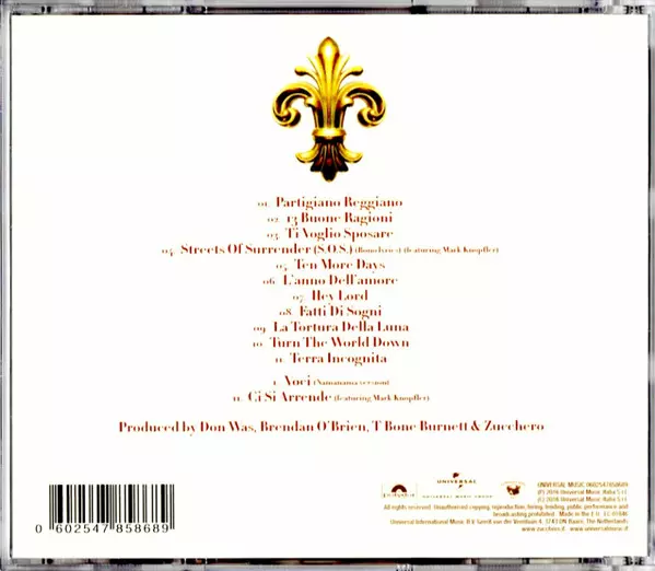 The production of the album was handled by three industry matadors - T-Bone Burnett (known for producing albums by Elvis Costello, Elton John and Tony Bennett), Brendan O'Brien (Bruce Springsteen, Pearl Jam and Bob Dylan) and Don Was (Rolling Stones, Iggy Pop, Bob Dylan). Guests include U2's Bono, who wrote the lyrics to Streets Of Surrender (S.O.S.) with Zuccher shortly after last year's tragedy at the Bataclan club in Paris. This song also features another guest, the legendary Mark Knopfler on guitar (and also on the song Ci Si Arrende)...